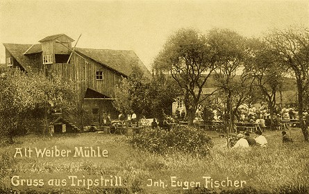Altweibermühle - eine Legende wurde zum Leben erweckt Eine alte Postkarte der Altweibermühle.(bro) Am 30. Juni 1929 eröffnete Eugen Fischer die Altweibermühle in Tripsdrill. Dies ist gleichzeitig die Geburtsstunde von Deutschlands erstem Erlebnispark. Freuten sich die Menschen bis in die 50er Jahre noch, das Tanzbein zu schwingen, so begeistern heute über 100 originelle Attraktionen auf 77 Hektar die Besucher. Die Altweibermühle ist und bleibt aber Ursprung und Wahrzeichen von Tripsdrill.
