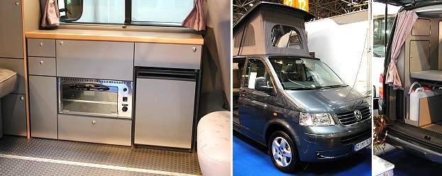 (Fotos:Claussen)(jc) Reimo aus dem südhessischen Egelsbach zeigt auf dem Caravan Salon seinen ersten vollwertigen Reisemobilausbau auf Basis eines Volkswagen T5 Kastenwagen. Relativ spät präsentiert damit der Kastenwagenausbau-Spezialist seine Variante eines klassischen Ausbaus auf der beliebtesten Basis in dieser Fahrzeugklasse. Der Reimo "Trio", der an die bekannten Ausbauten auf T4-Basis erinnert, verfügt über Kanister- Wasseranlage, die praktische Variotech- Sitzbank und als Besonderheit einen Einbau- Gasgrill.