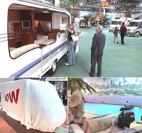 Wohnwagen und Wohnmobile von außen und innen betrachten kann man in Düsseldorf nach Lust und Laune. Ob jede Neuheit ein "Wow"-Erlebnis auslöst (unten links), wird sich ab morgen zeigen. Unten rechts ein Blick in die Sonderschau "Caravaning Wassersport". (Fotos:Richter)