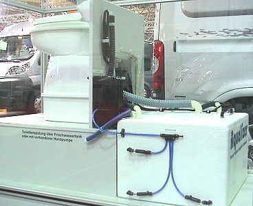 Miniklärwerk soll Entsorgung in Reisemobilen und Caravans revolutionieren (Foto:Richter)(hr) Urlaubsende, ohne dass der Fäkalientank geleert werden muss – wer hätte nicht schon davon geträumt? Elia Akkawi und sein Team vom Reisemobilhersteller HRZ machen es in Zukunft möglich: Sie entwickelten ein Miniklärwerk, das die übliche Kassette ersetzen soll. Fäkalien und Toilettenpapier werden gehäckselt und biologisch zu Grauwasser zersetzt, das in den Abwassertank geleitet wird. Innerhalb von weniger als 24 Stunden soll die Verwandlung vollzogen sein. Verkaufsstart für den "Aqualizer", der dieser Tage auf dem Caravan Salon in Düsseldorf gezeigt wird, ist voraussichtlich im Jahr 2007.