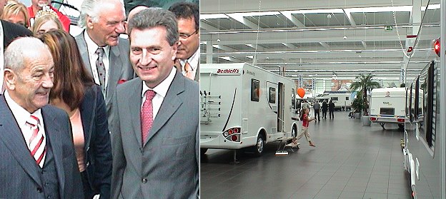 Der Ministerpräsident Baden Württembergs, Günther Oettinger, ließ sich nicht lange bitten und eröffnete gestern persönlich gemeinsam mit Vorzeige-Mittelständler Erwin Hymer das Expocamp. In der reisemobilen "S-Klasse" von Hymer rollte er in die Ausstellungshalle, zeigte sich hernach durchaus angetan vom Komfort des Reisemobils und schloss nicht aus, dass er sich mal "so ne Kiste ausleihen" werde.