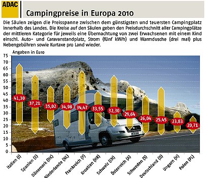 Italien nach wie vor am teuersten (Infogramm: ADAC)(red) (adac) Campen ist in Deutschland im Durchschnitt nach wie vor günstig. Das zeigt ein ADAC-Vergleich der Campingpreise in Europa. Im europäischen Mittel kostet eine Übernachtung für zwei Erwachsene und ein zehnjähriges Kind inklusive Standplatz, Nebengebühren, Strom, Warmduschen und Kurtaxe 32,16 Euro. Deutschland liegt mit 25,45 Euro fast sieben Euro unter dem Durchschnittswert. Nur Polen (20,71 Euro) und Ungarn (23,83 Euro) sind günstiger. Die Campingpreise in Deutschland stiegen im Vergleich zum Vorjahr um knapp drei Prozent, 2009 kostete eine Übernachtung noch 24,75 Euro.
