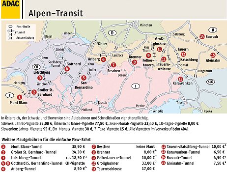 Alpentransit 2012 (Infogramm: ADAC)(red) (adac) Auf dem Weg in den Süden haben es Urlauber oft eilig. Wer an den Mautstellen nicht warten möchte, nutzt laut ADAC am besten die Videomaut. Der Club hält die Tickets für den Brenner (8 Euro), die Tauernautobahn (Tauern- und Katschbergtunnel 10 Euro), die Pyhrnautobahn (Bosruck- und Gleinalmtunnel 12 Euro) und den Arlberg (8,50 Euro) bereit.