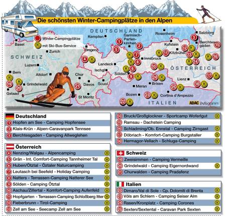 Camper-Romantik auch im Schnee (Quelle:ADAC)(hr) (adac) Der ADAC hat die 25 schönsten Winter-Campingplätze der Alpen in Deutschland, Österreich, Italien und der Schweiz in der Nähe attraktiver Ski- und Wintersportgebiete ausgewählt. Ski-Pisten und Langlauf-Loipen liegen bei den meisten Plätzen in unmittelbarer Nähe. Viele Wintersportorte bieten ihren Camping-Gästen zusätzlich einen Skibus-Service mit einer Haltestelle direkt am Platz.