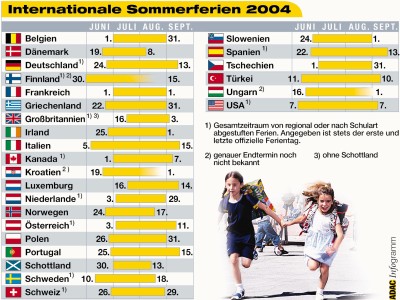 Ebenfalls sollten Urlauber bedenken, dass auch im europäischen Ausland im Sommer Hochsaison auf den Straßen angesagt ist. Der ADAC hat alle Sommerferientermine der europäischen Reiseländer, der USA sowie Kanada für 2004 zusammengefasst.